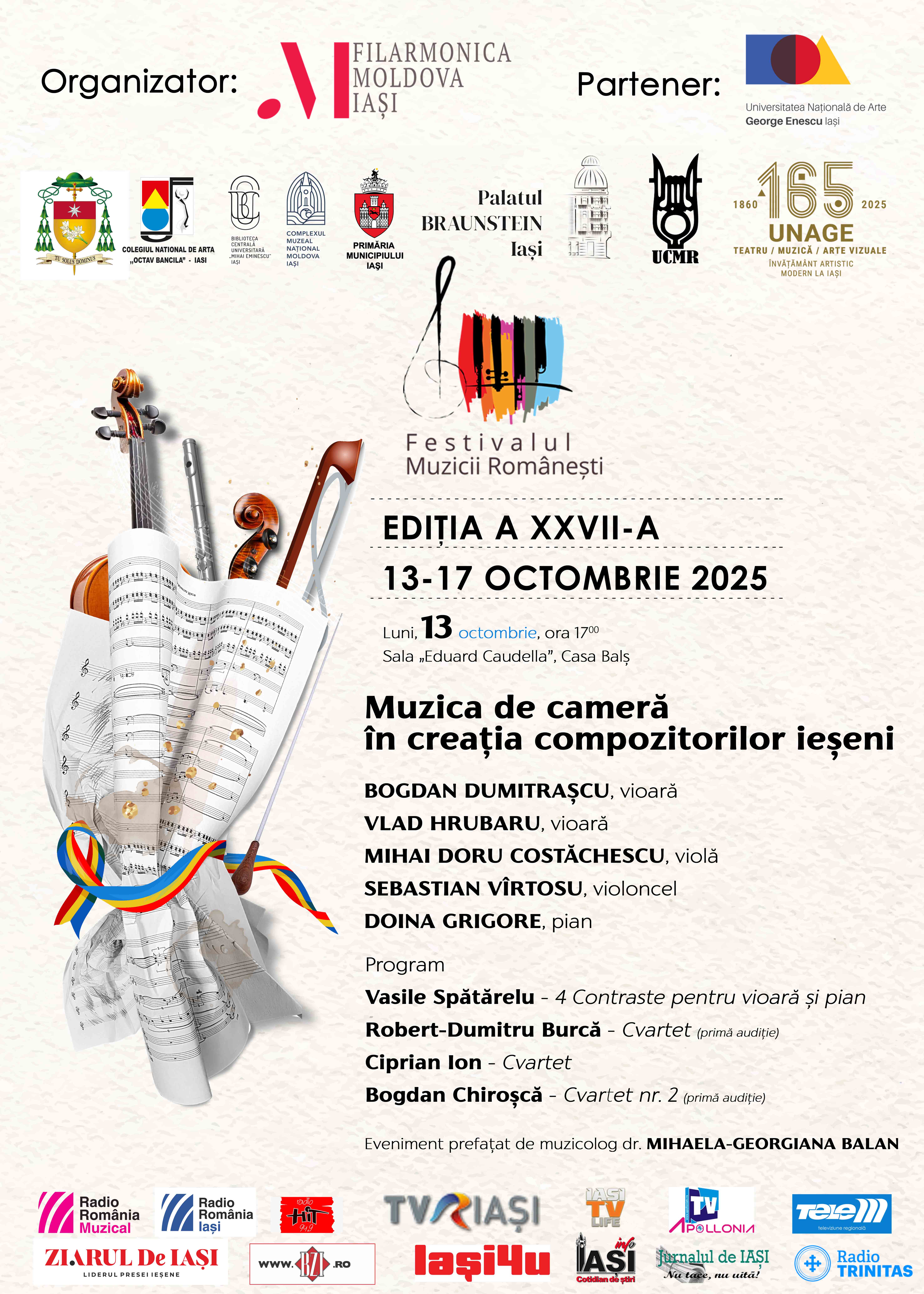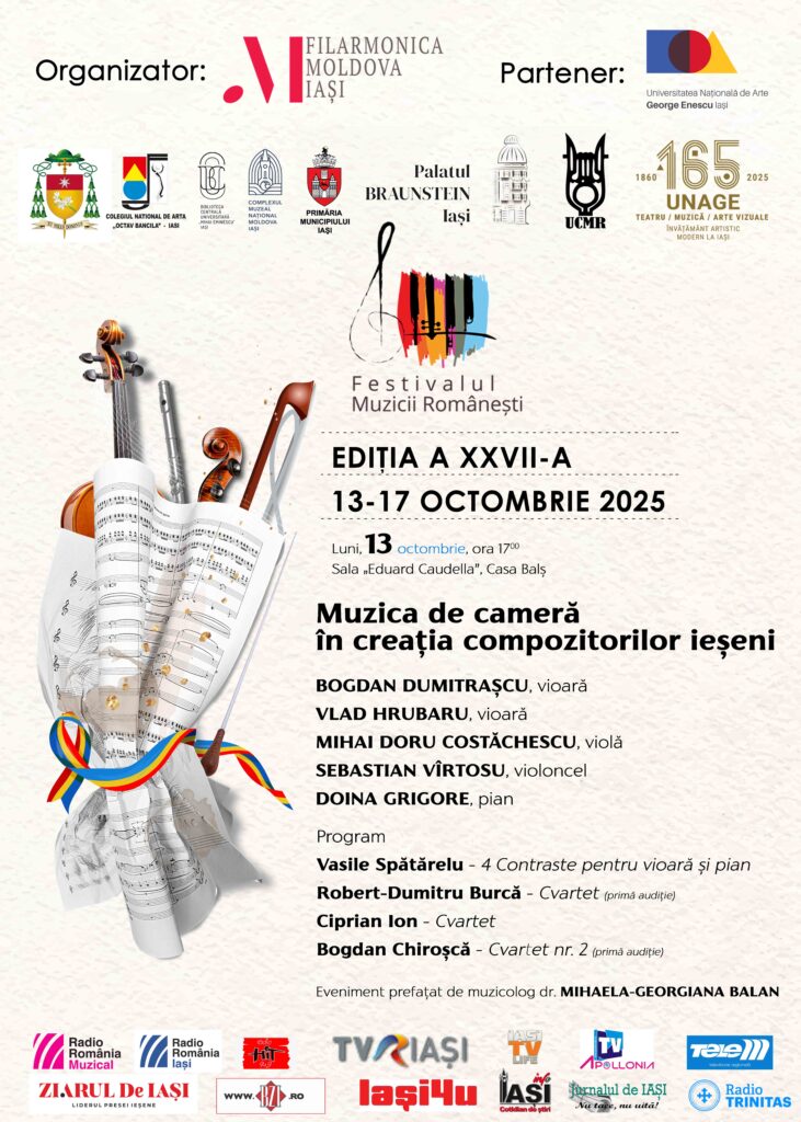 Luni, 13 oct., ora 17 | Sala „E. Caudella”, Casa Balș – Muzica de cameră în creația compozitorilor ieșeni | Concert cameral