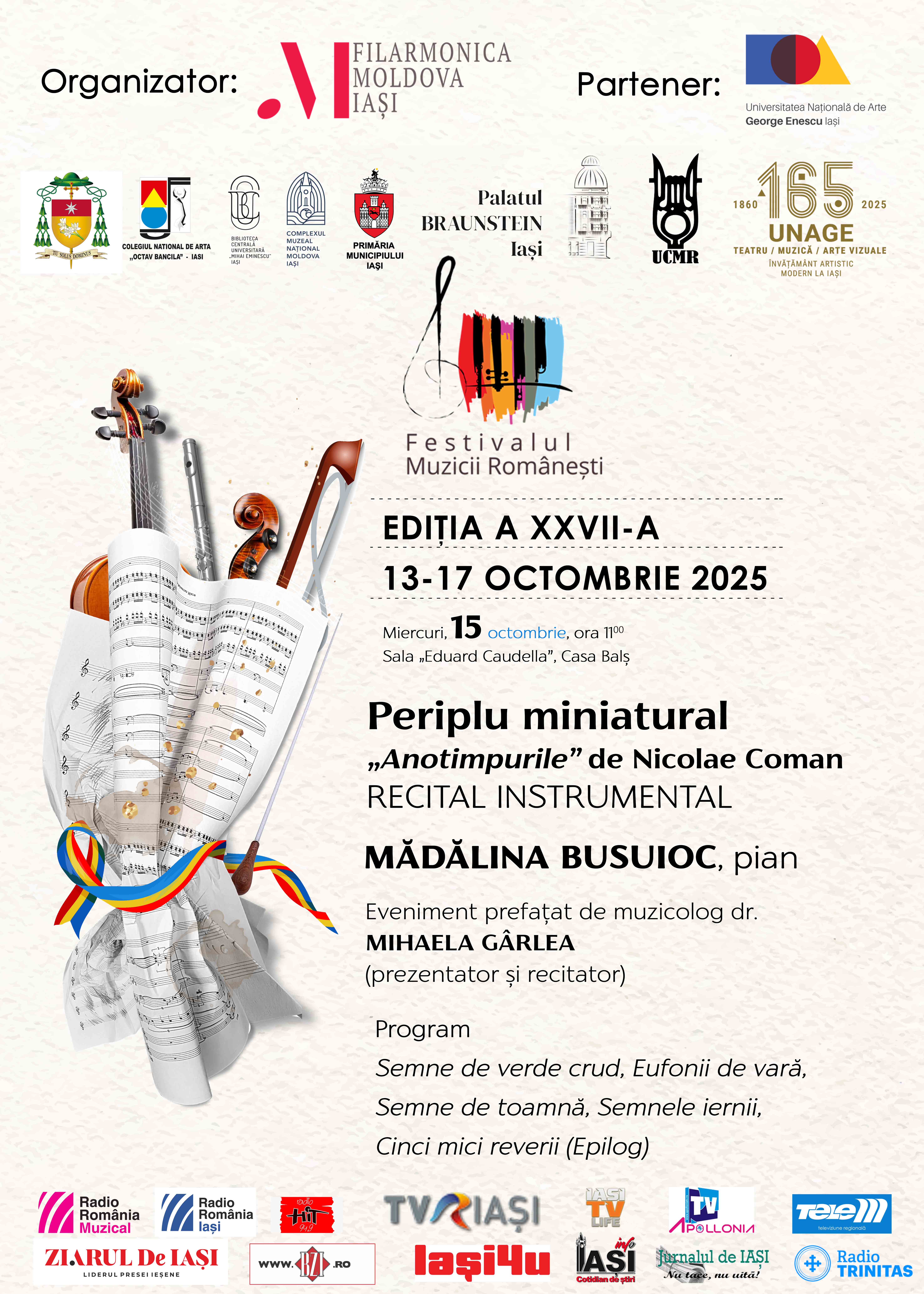 Miercuri, 15 oct., ora 11 | Sala „E. Caudella”, Casa Balș – Periplu miniatural – „Anotimpurile” de Nicolae Coman | Recital instrumental | Mădălina Busuioc, pian