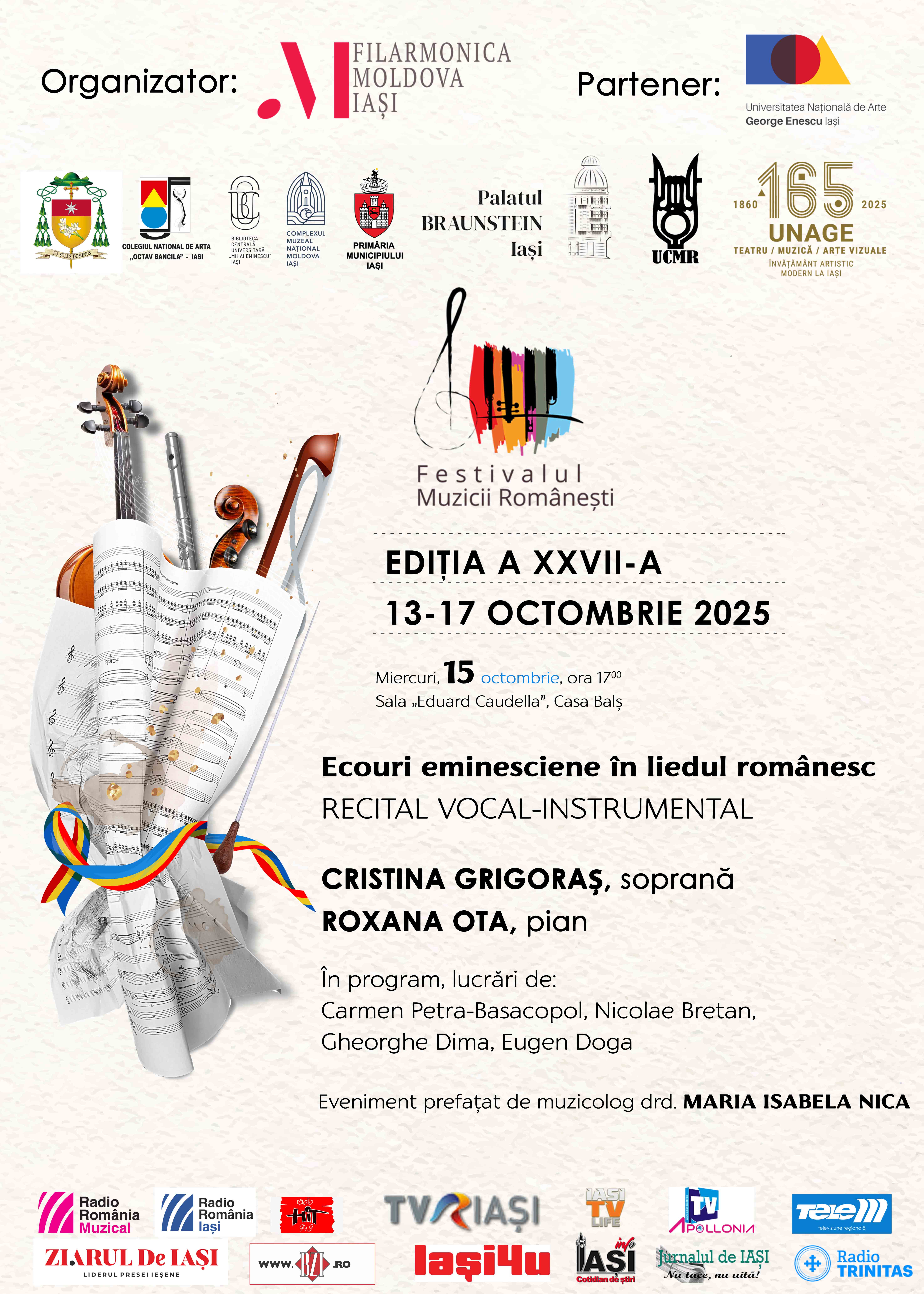 Miercuri, 15 oct., ora 17 | Sala „E. Caudella”, Casa Balș – Ecouri eminesciene în liedul românesc | Recital vocal-instrumental
