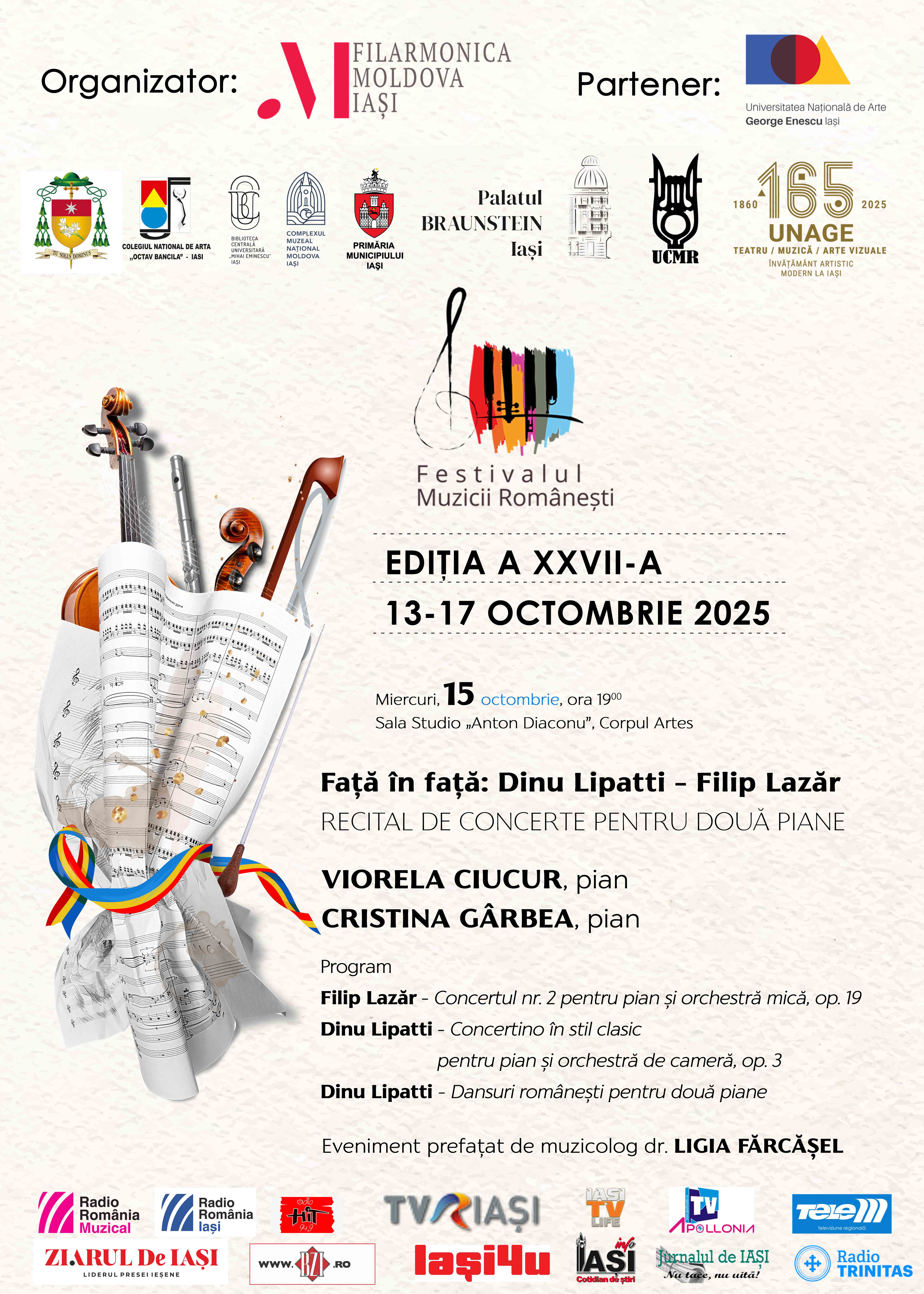 Miercuri, 15 oct., ora 19 | Sala Studio „Anton Diaconu”, Corpul Artes – Față în față: Dinu Lipatti – Filip Lazăr | Recital de concerte pentru 2 piane
